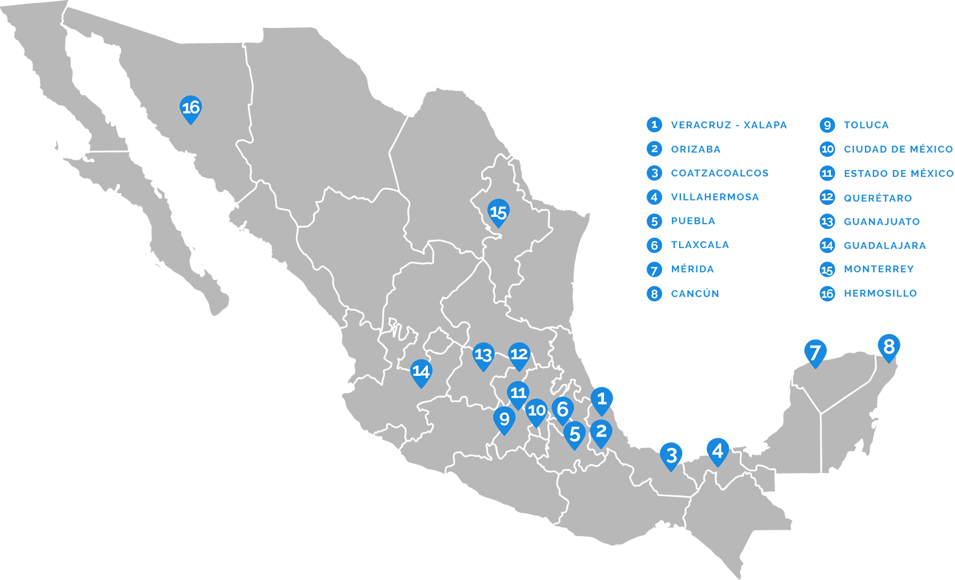 Actualmente, contamos con presencia en las siguientes ciudades: